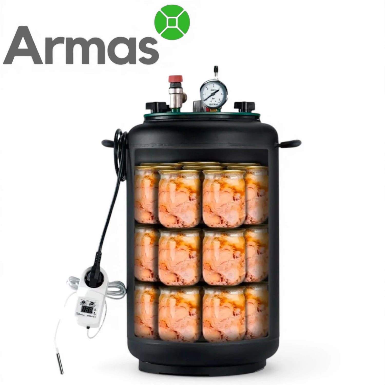 Electric universal autoclave UTEHO UTEH-24E, 35 l for home canning with capacity up to 24 x 0.5 l, 14 x 1 l, 3 x 2 l, or 2 x 3 l jars. In the base configuration, this model type is a water autoclave, but for operation in steam mode an additional steam valve is required.