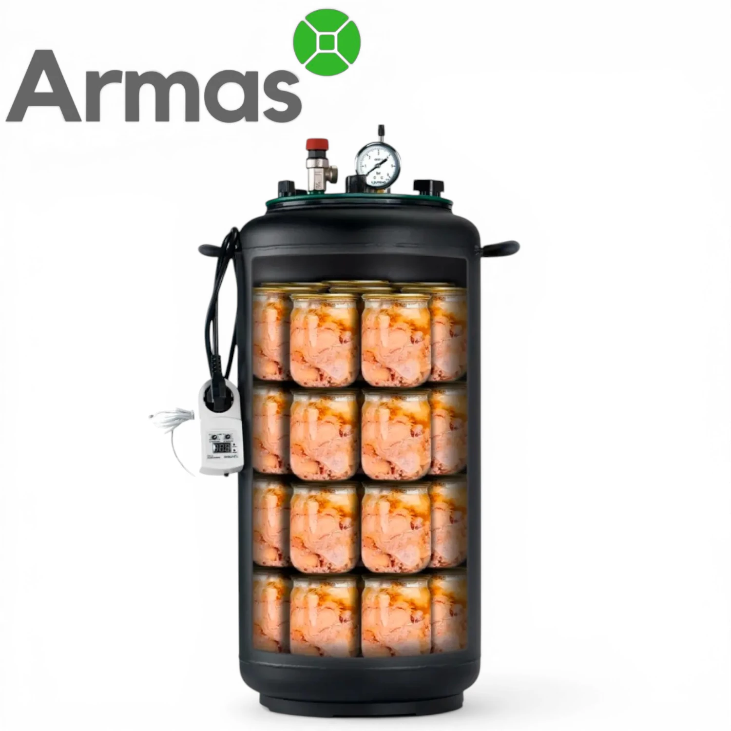 Electric universal autoclave UTEHO UTEH-32E, 45 l for home canning with capacity up to 32 x 0.5 l, 21 x 1 l, 6 x 2 l, or 4 x 3 l jars. In the base configuration, this model type is a water autoclave, but for operation in steam mode an additional steam valve is required.