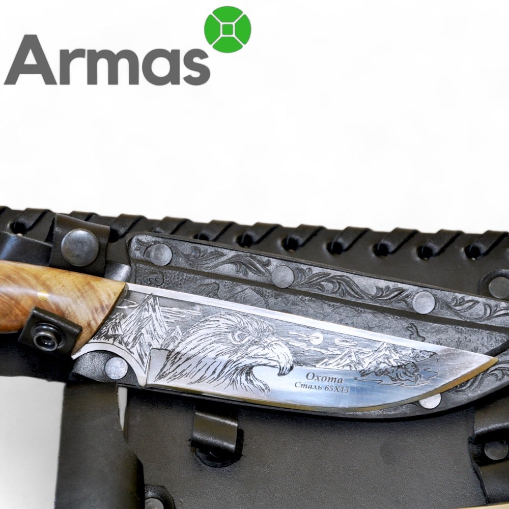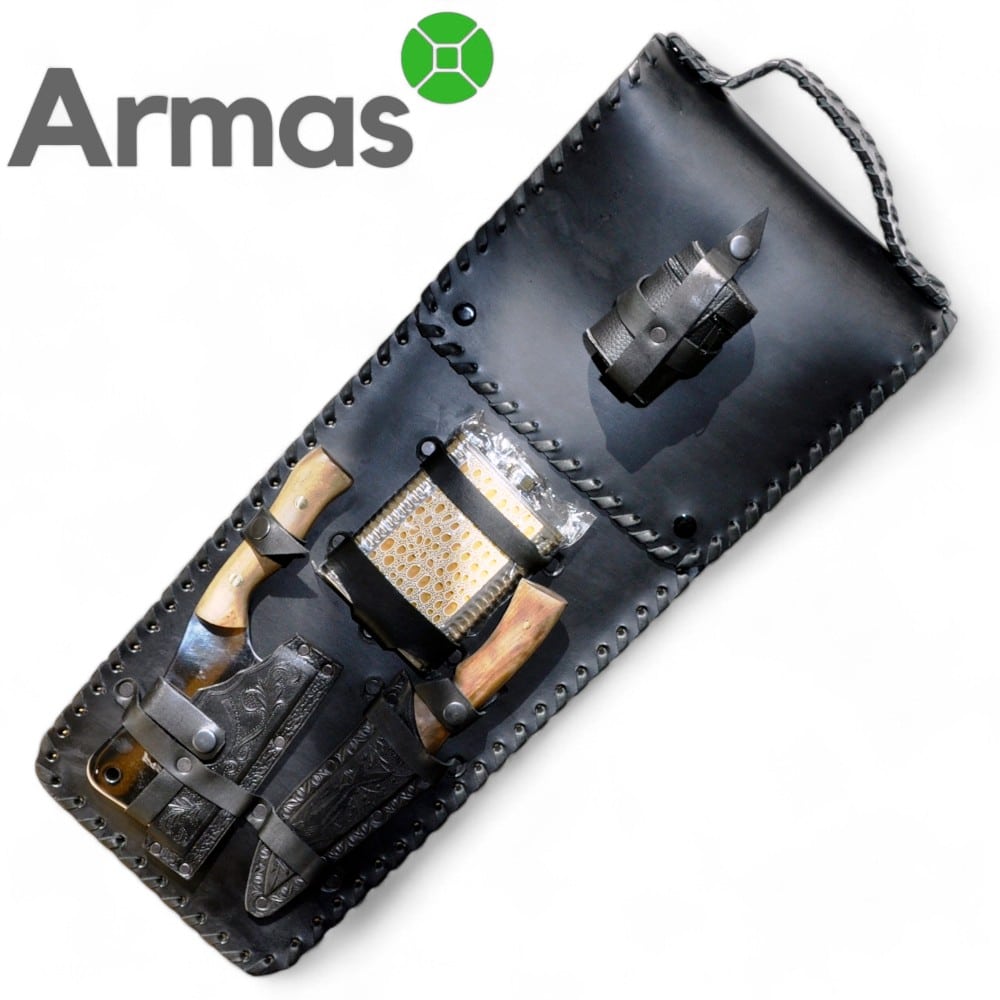 • Knife with leather cover L140/130mm (walnut handle, steel 65×13/59 HRC);