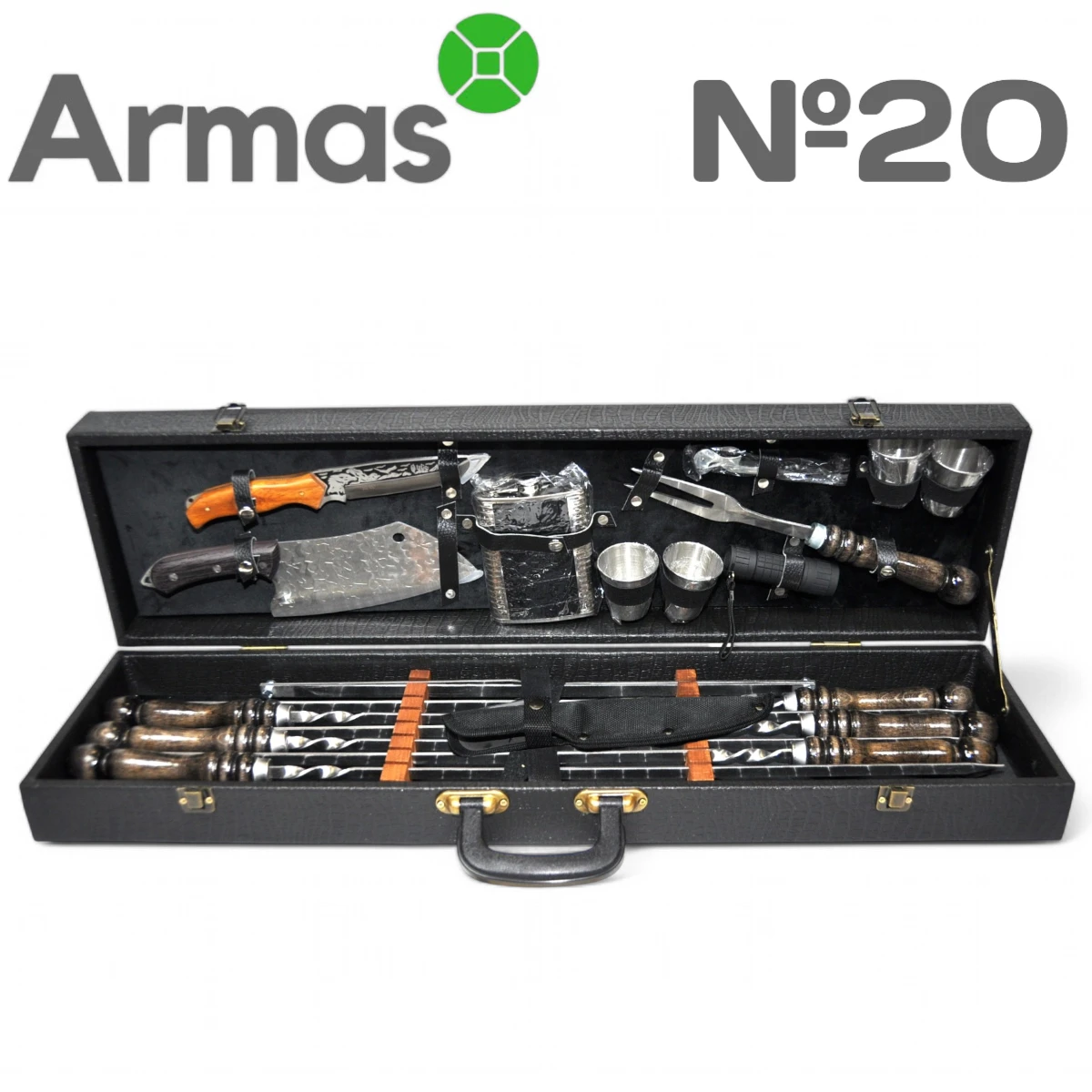 Elegant and multifunctional set for cooking over coals or on the grill, packed in a stylish suitcase with handle. This set is perfect for everyday use at the mangal or as a gift for a true barbecue lover.