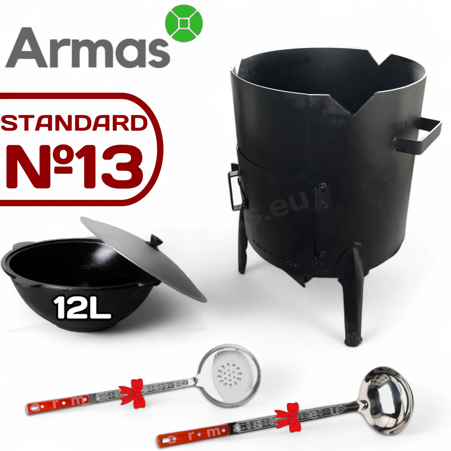 Set Standard No. 13: stove for 12–16 l kazan, 12 l Uzbek cast iron kazan with lid, 46 cm pilaf and soup spoons – a universal solution for cooking delicious meals at home and outdoors, ideal for a group of up to 10 people.