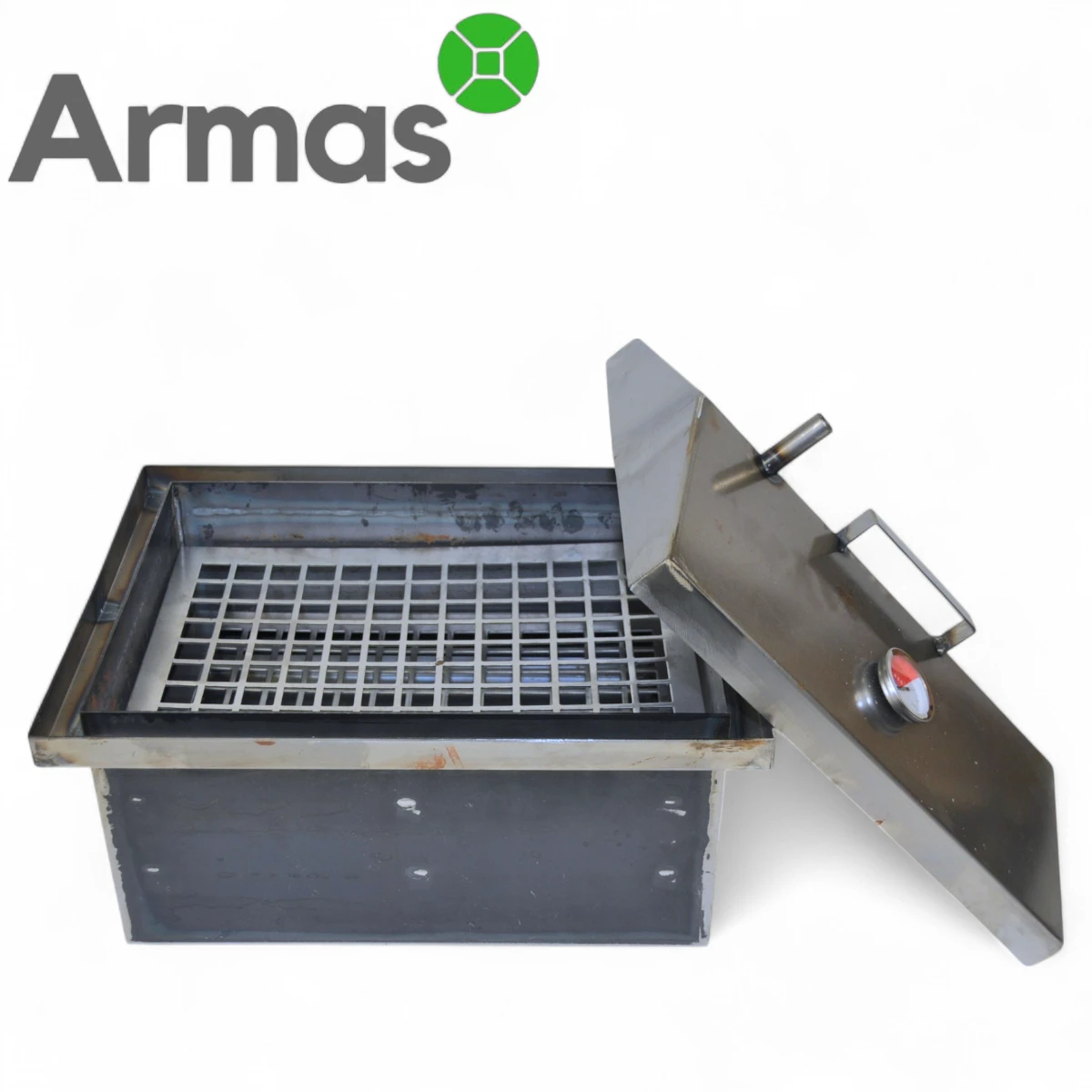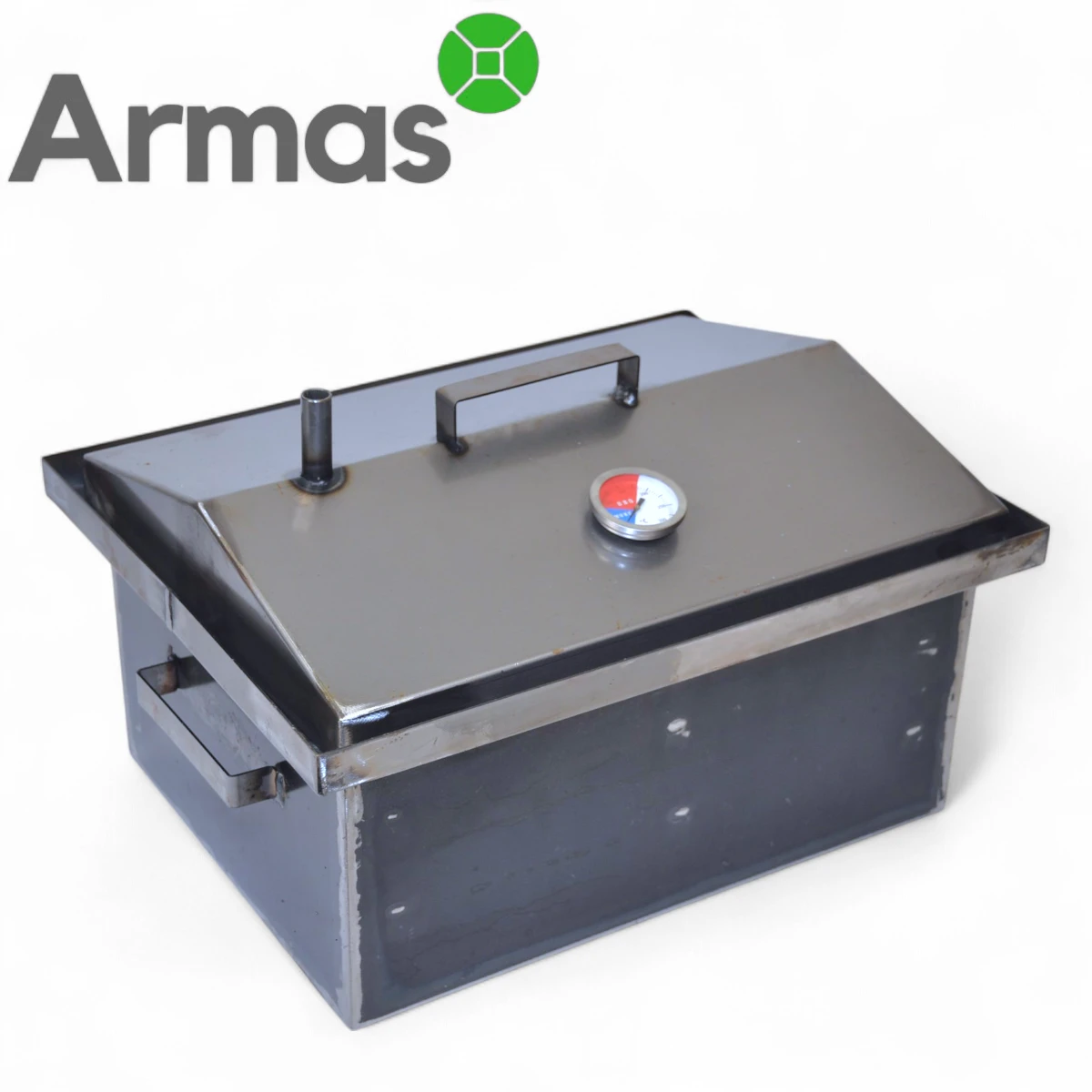 The smoker with a hydro-lock and thermometer is the perfect solution for hot smoking various products at home, including meat, fish, cheese, and vegetables. Both gas and electric cookers can be used as a heat source.