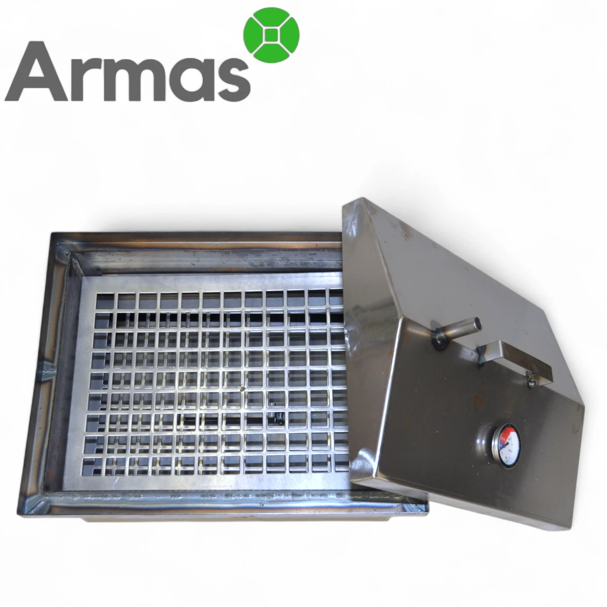 The smoker with a hydro-lock and thermometer is the perfect solution for hot smoking various products at home, including meat, fish, cheese, and vegetables. Both gas and electric cookers can be used as a heat source. The smoker is equipped with two steel grates, a fat tray and a thermometer. The process starts by igniting the shavings on a high fire and then moving to a minimum fire to continue smoking. Thanks to the waterproofing, smoke does not escape into the room during the smoking process.