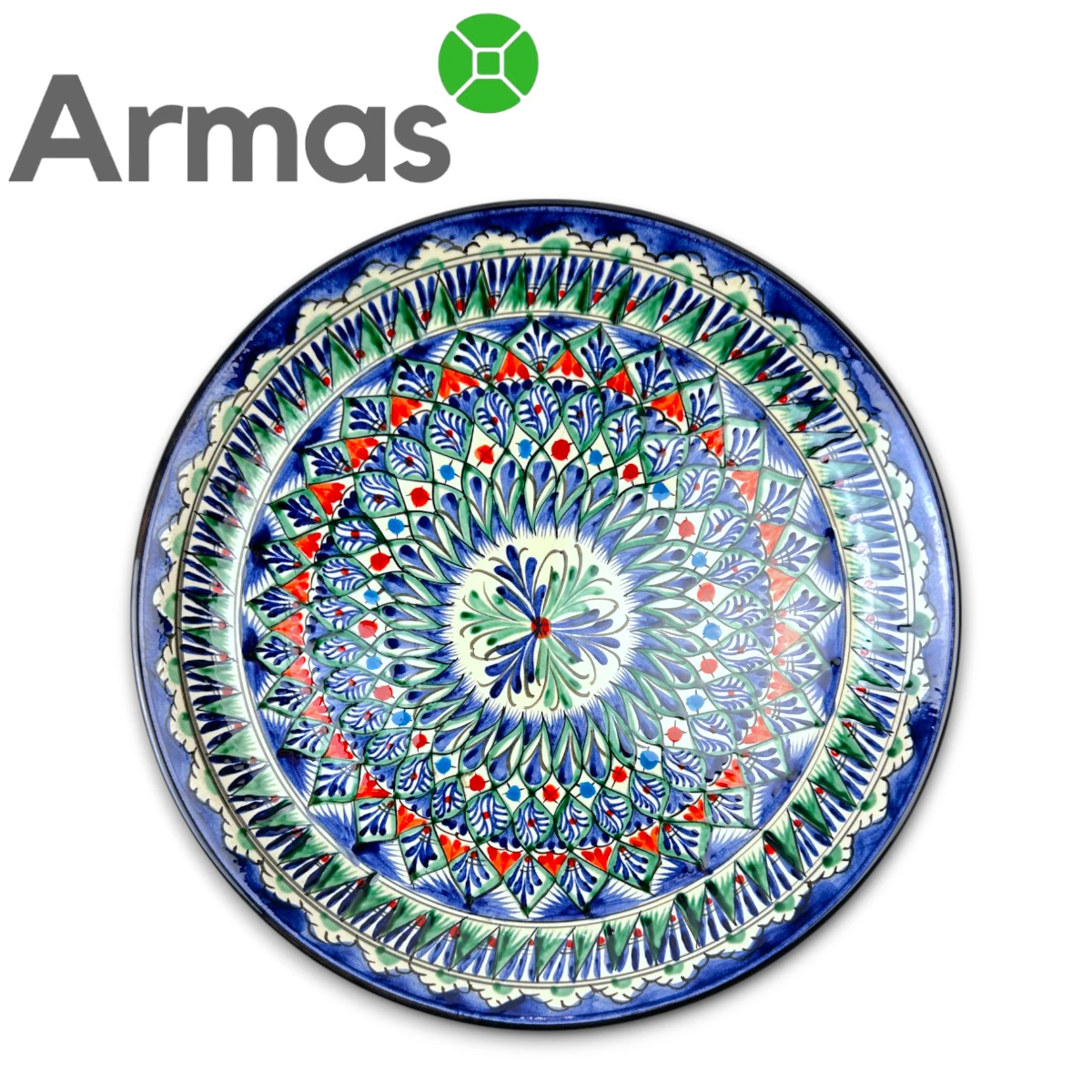 Uzbek pilaf plate Lyagan 38 cm – handmade, oriental pattern, blue with red