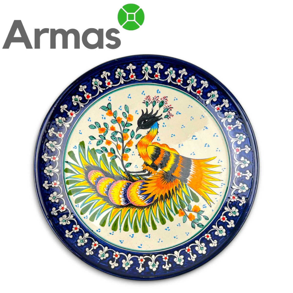 Striking and decorative Uzbek ceramic plate featuring an exotic bird symbolizing oriental richness and freedom. Handmade from natural clay, perfect for serving dishes or hanging as wall décor.
