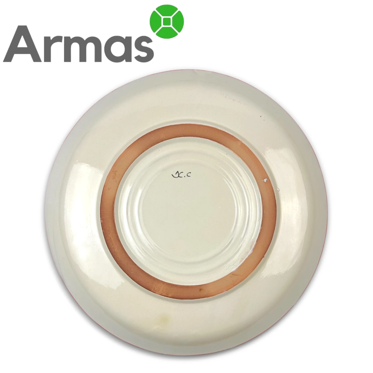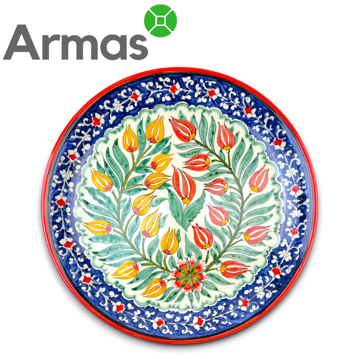 Elegant ceramic plate from Uzbekistan featuring an oriental floral pattern and contrasting red rim. Handmade from natural clay, each piece is unique. Suitable for festive serving or as a decorative accent.