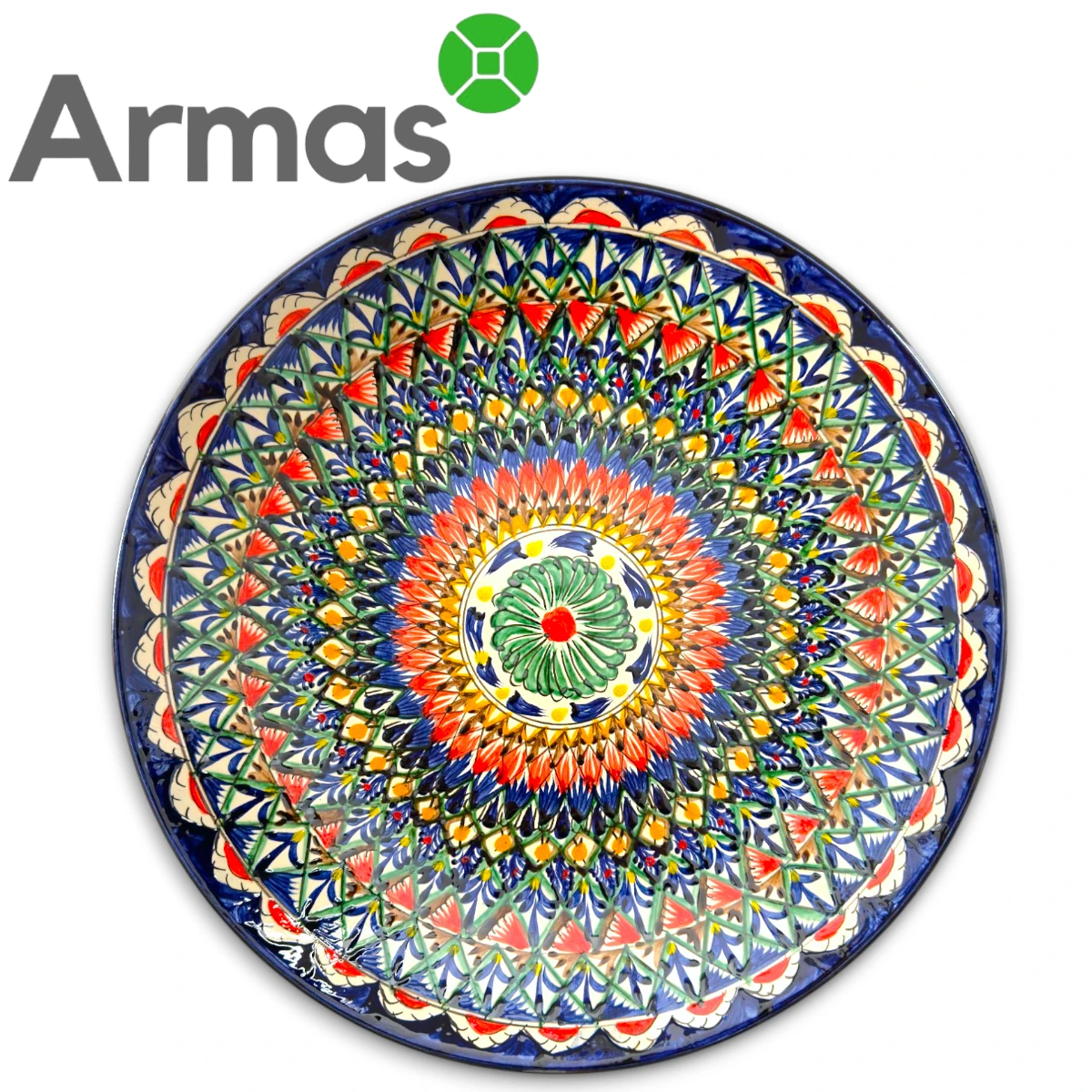 Large traditional Uzbek Lyagan plate with a bright floral mandala design – ideal for serving pilaf and other oriental dishes. Handmade in glazed ceramic.