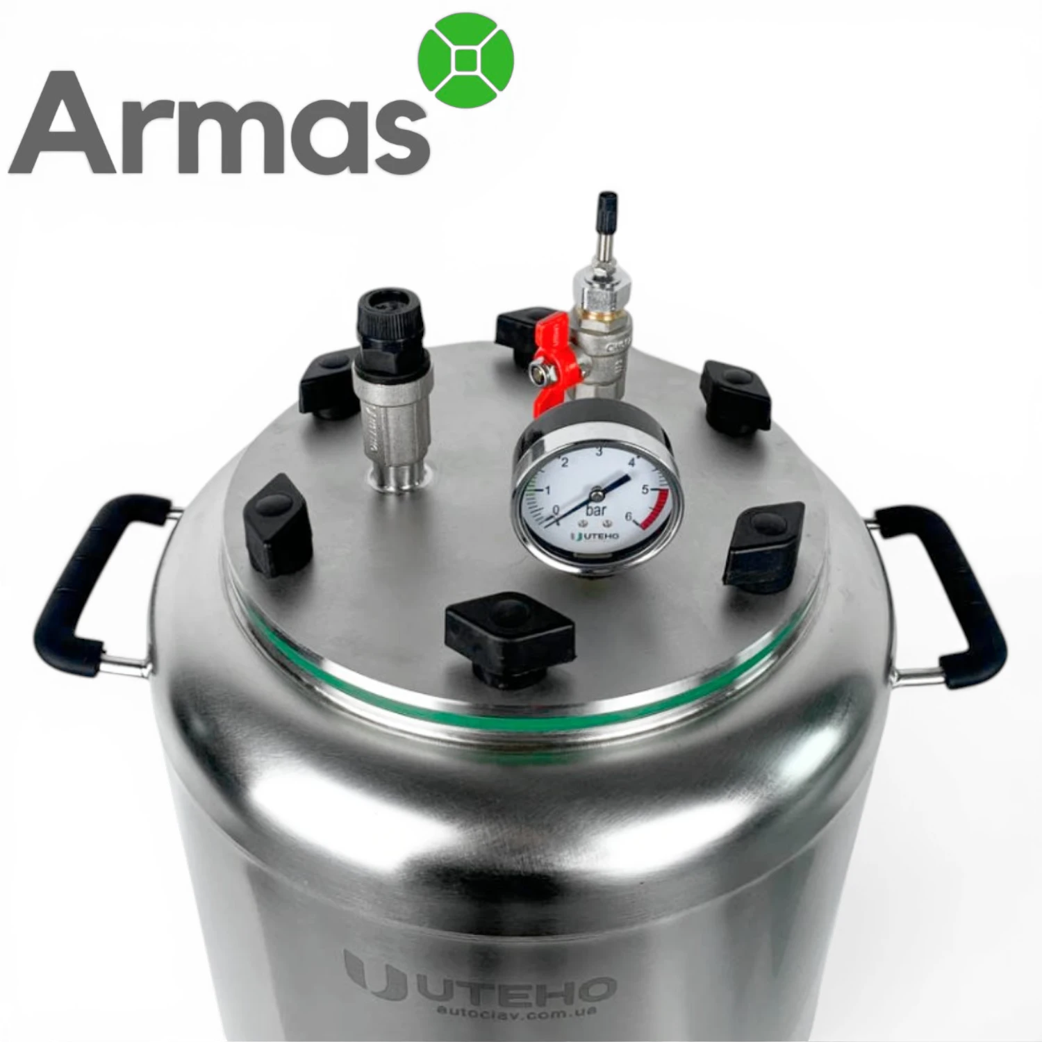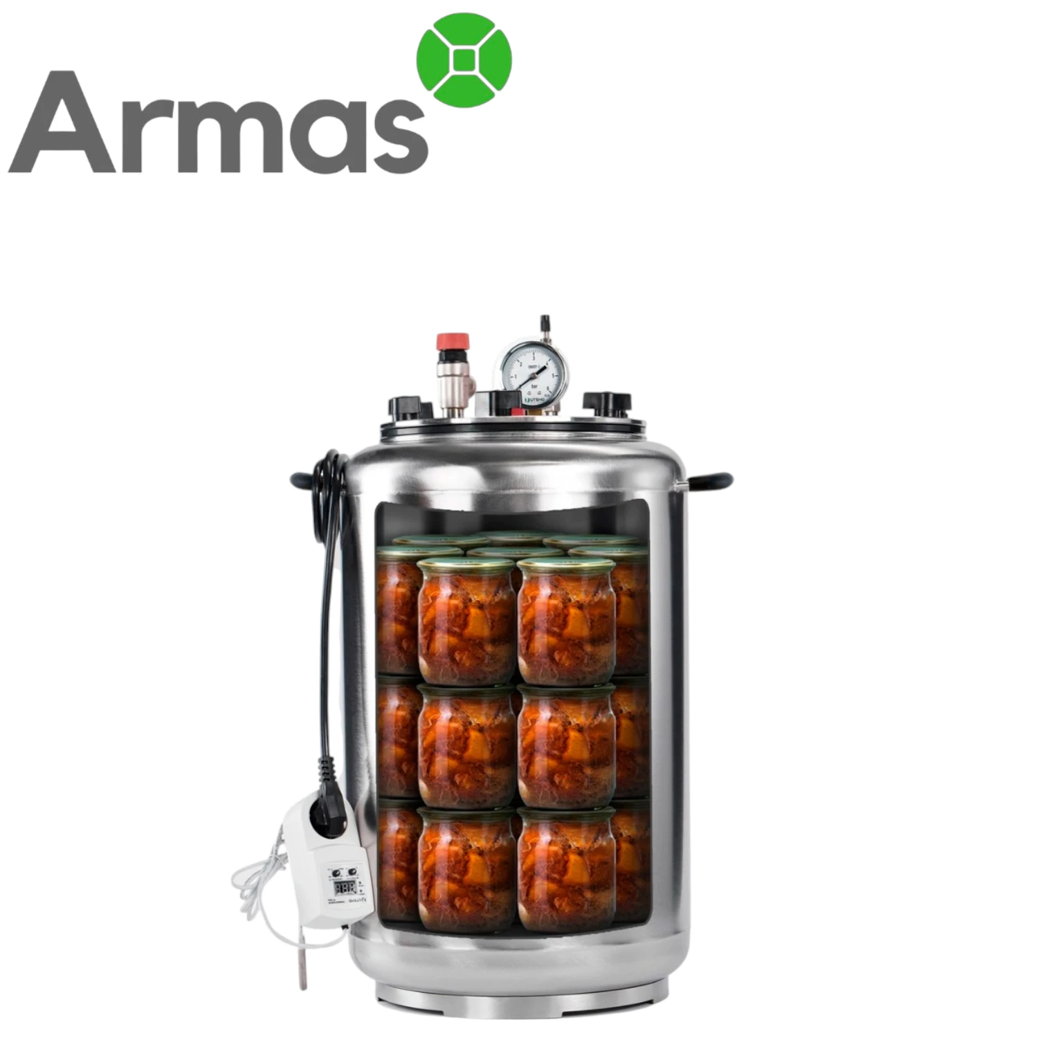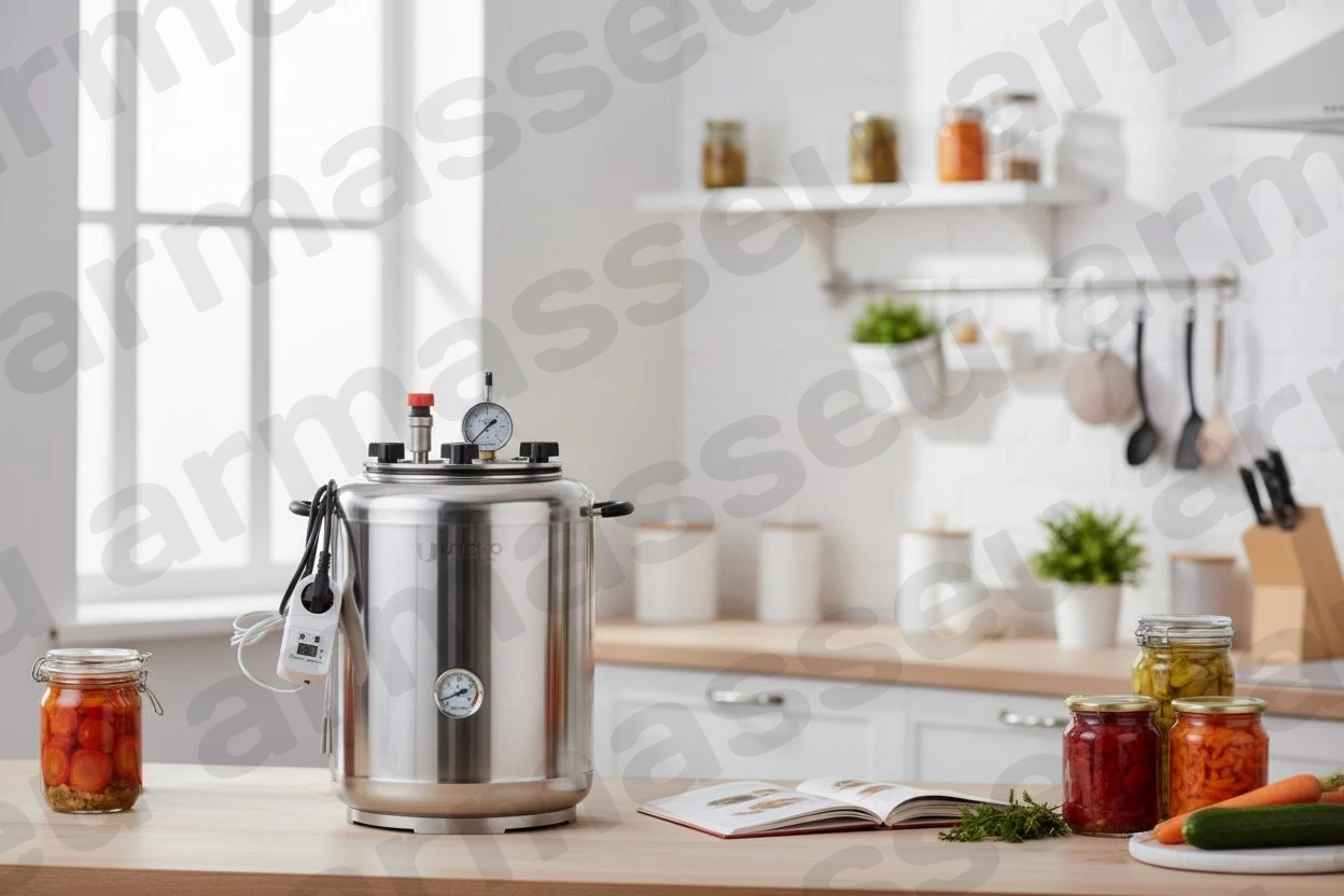 Elektriskais universālais autoklāvs UTEHO A-24E no nerūsējošā tērauda, 35 l mājas konservēšanai ar ietilpību līdz 24 x 0,5 l, 14 x 1 l, 3 x 2 l vai 2 x 3 l burkām. Pamatkonfigurācijā šī modeļa tips ir ūdens autoklāvs, bet darbam tvaika režīmā nepieciešams papildu tvaika vārsts.