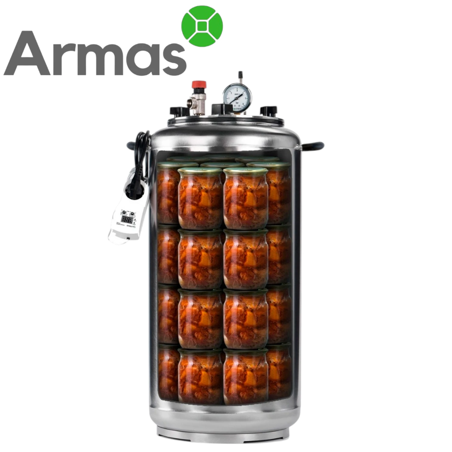 Elektriskais universālais autoklāvs UTEHO A-32E no nerūsējošā tērauda, 45 l mājas konservēšanai ar ietilpību līdz 32 x 0,5 l, 21 x 1 l, 6 x 2 l vai 4 x 3 l burkām. Pamatkonfigurācijā šī modeļa tips ir ūdens autoklāvs, bet darbam tvaika režīmā nepieciešams papildu tvaika vārsts.