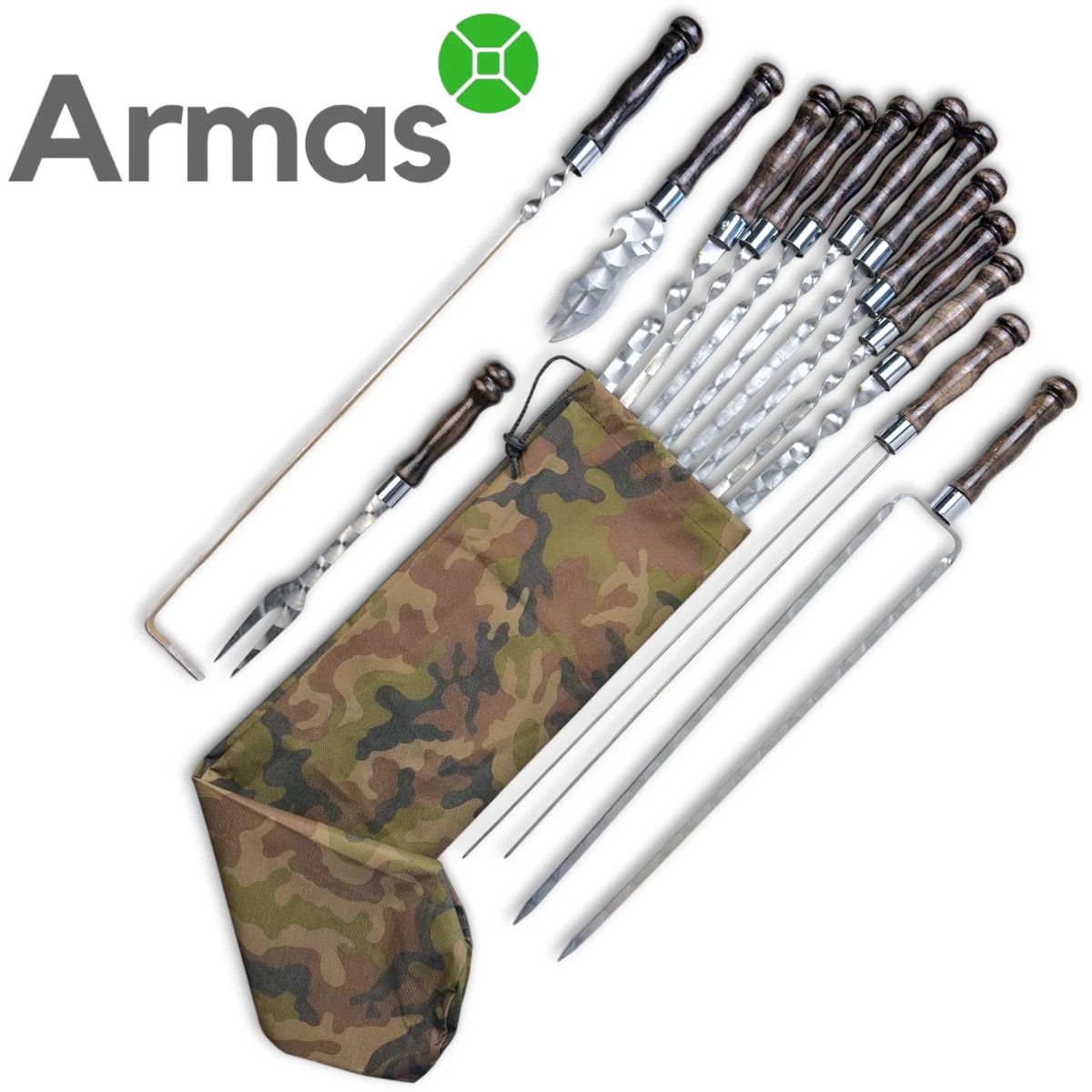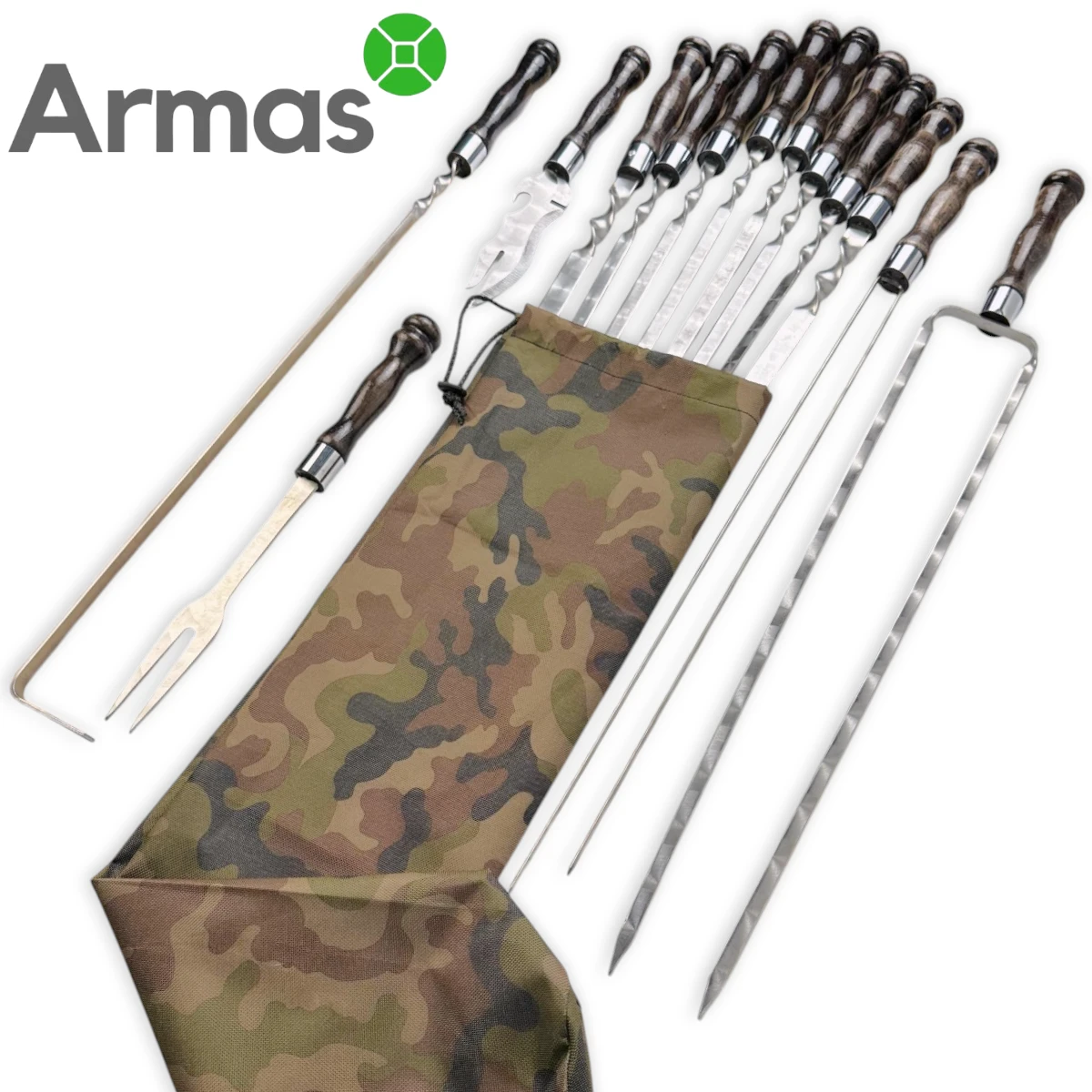 Universāls un praktisks komplekts grilēšanai un piknikam, kas piemērots lietošanai mājas apstākļos, izbraucienos dabā vai kempingā. Visi šampuri un piederumi izgatavoti no augstas kvalitātes nerūsējošā tērauda ar 3 mm biezumu, kas nodrošina to izturību, vieglu kopšanu un ilgmūžību. Darba garums – 50 cm, kas ir optimāls lielākajai daļai standarta mangalu. Komplektam pievienota izturīga kamuflāžas soma, kas paredzēta ērtai uzglabāšanai un transportēšanai.