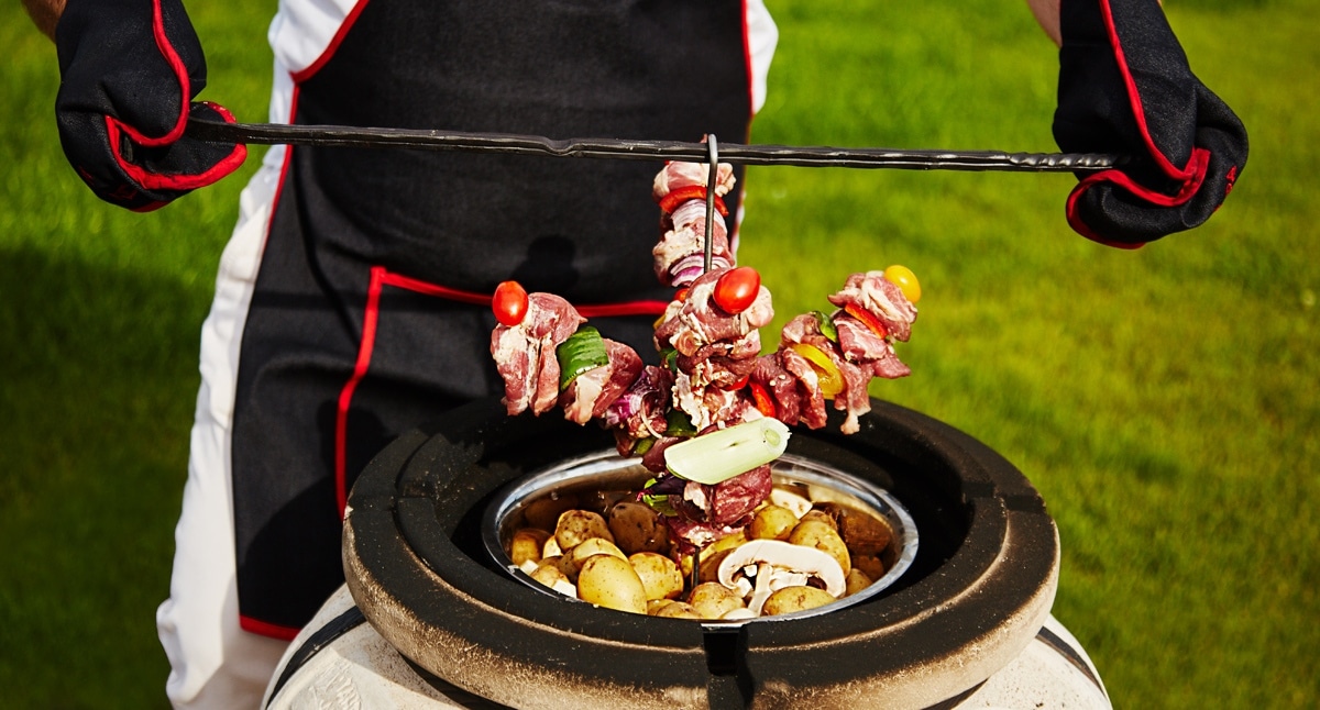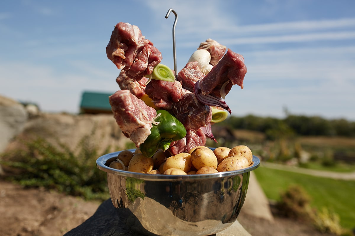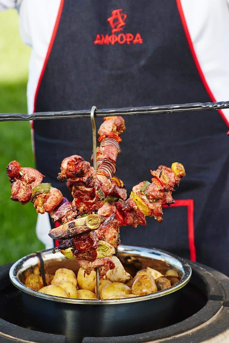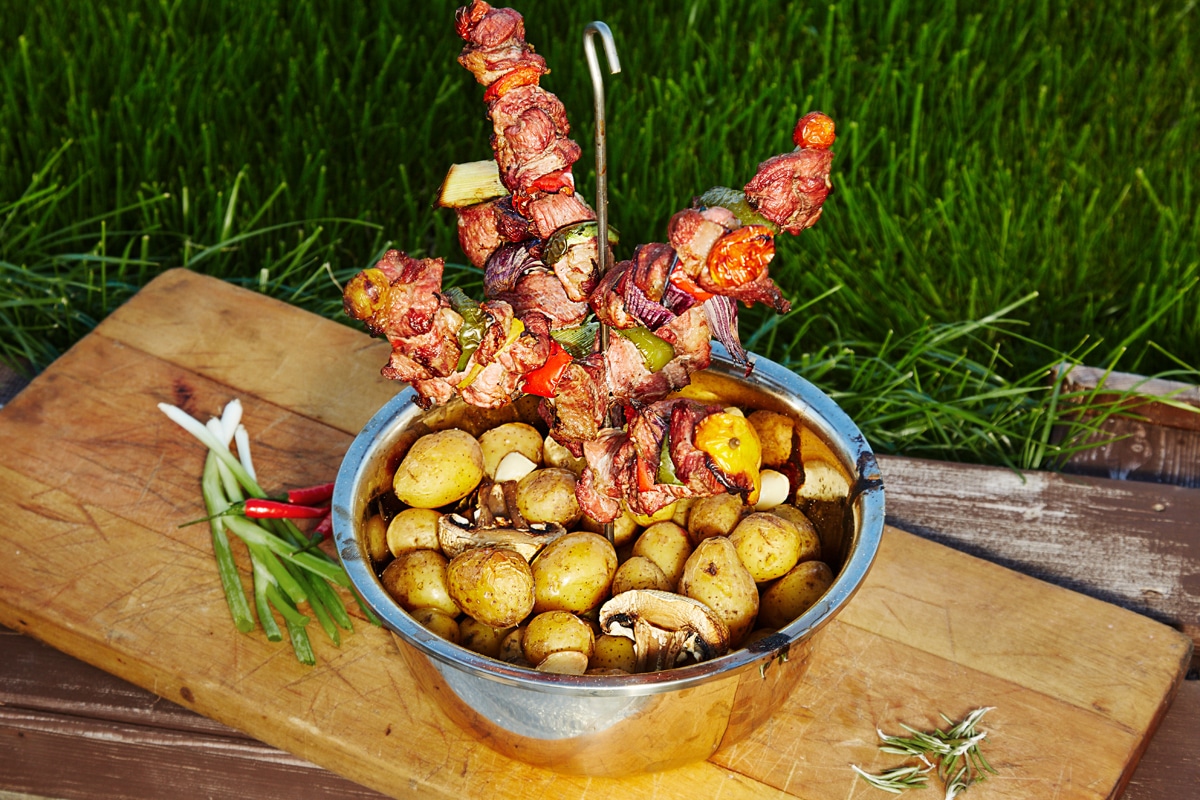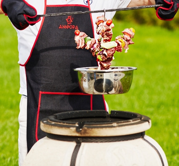 Tā ir ērta ierīce, kur bļodā var ievietot garnīru, piemēram, kartupeļus un citus dārzeņus, bet gaļu uzvilkt uz iesmiem.