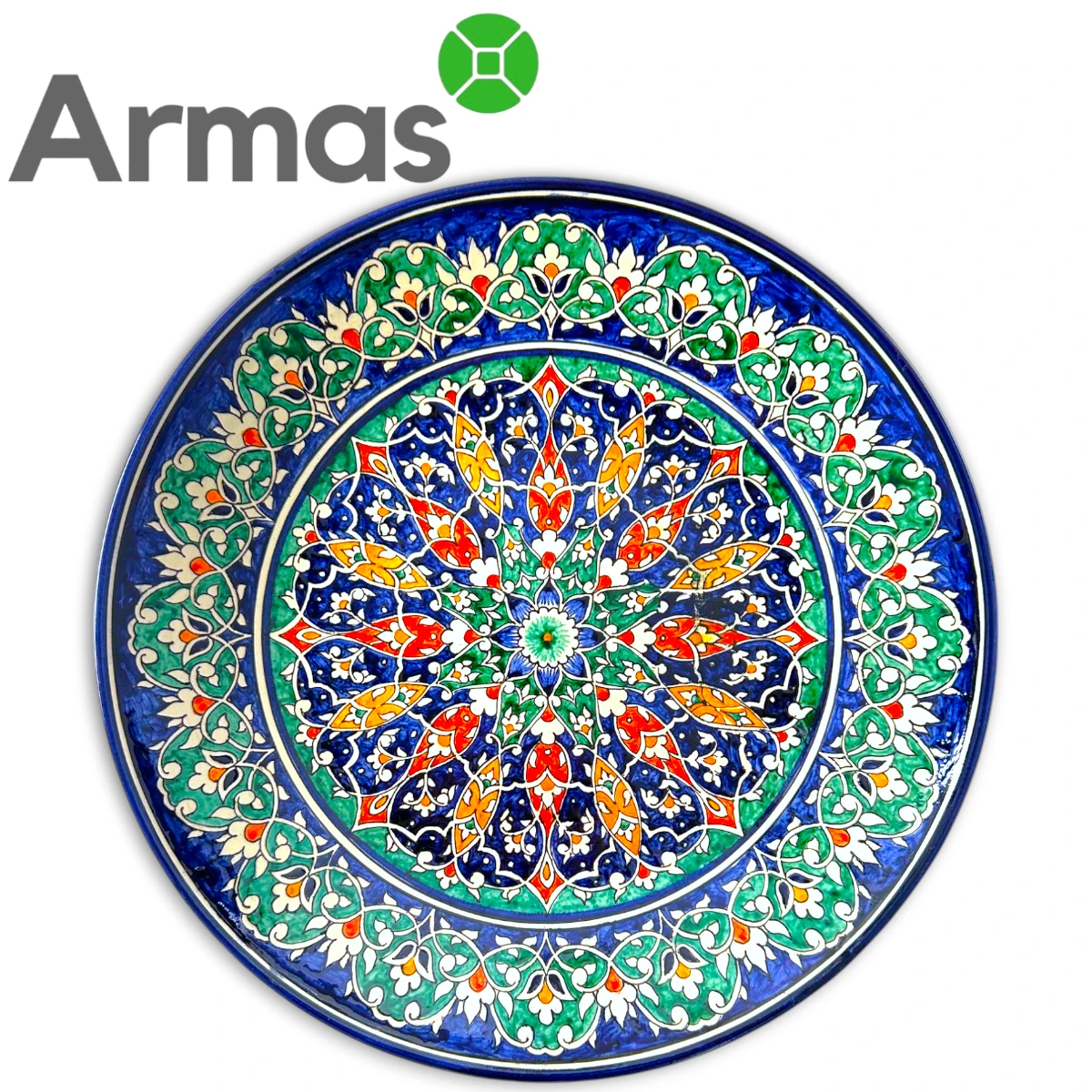 Klasisks uzbeku šķīvis tumši zilā tonī ar bagātīgu austrumu ornamentu sarkanā, dzeltenā, baltā un zaļā krāsā. Roku darbs. Lieliski piemērota plova pasniegšanai, augļiem vai kā interjera dekors.