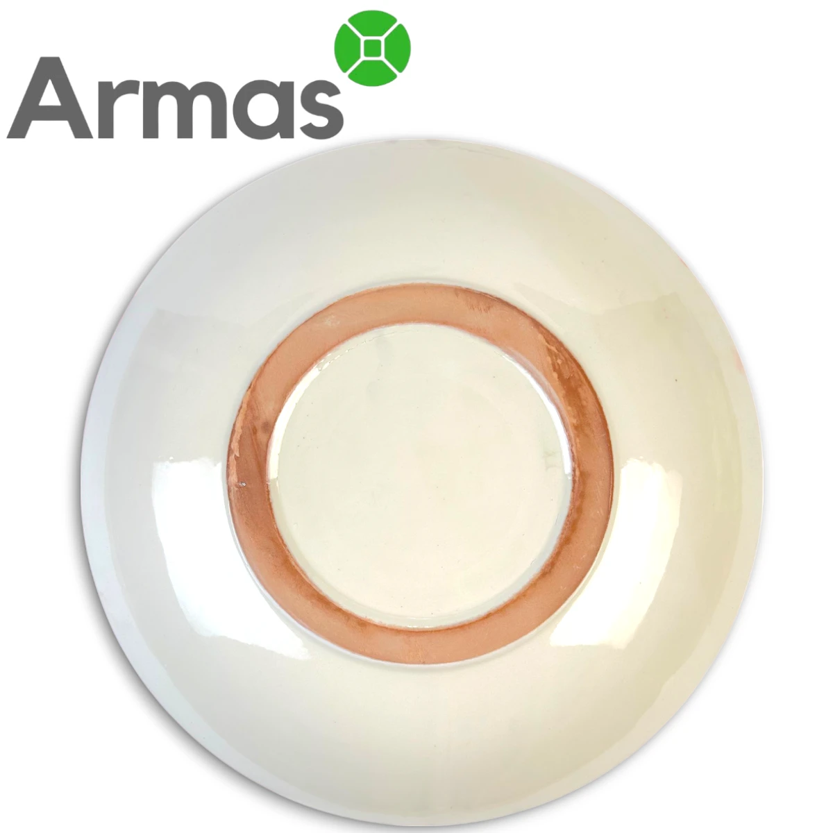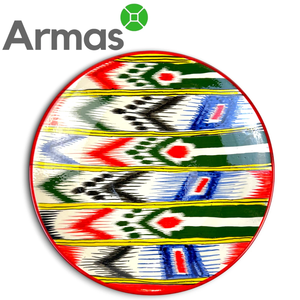 Узбекская керамическая тарелка ручной работы диаметром 42 см с цветным орнаментом и красным ободком. Идеально подходит для подачи плова, фруктов или в качестве декора интерьера.