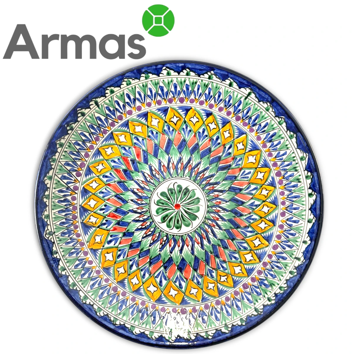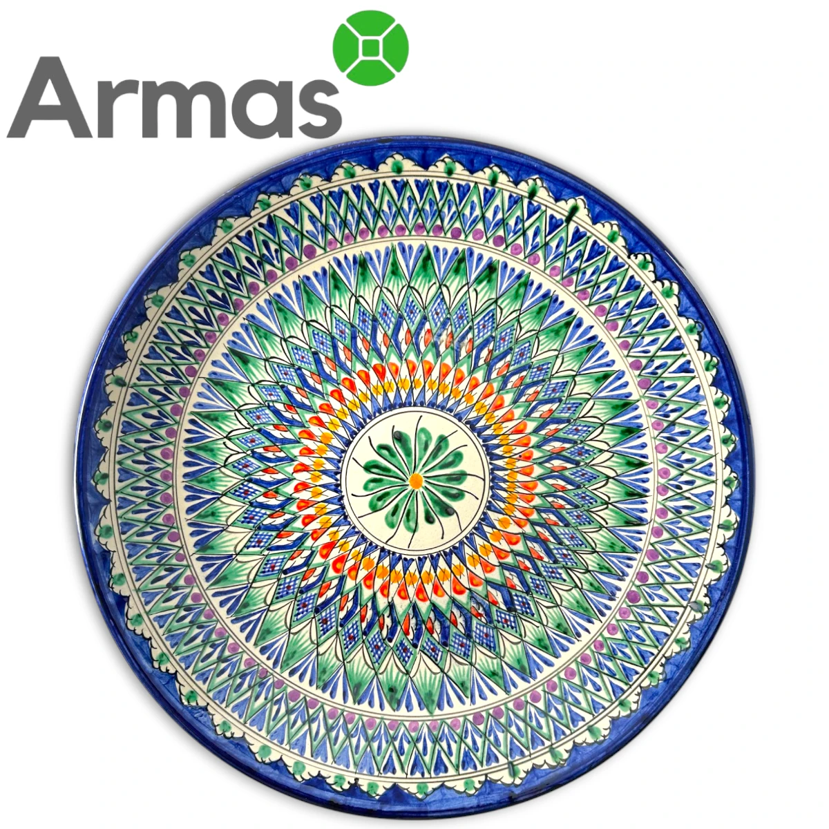 Узбекская тарелка ручной работы с ярким орнаментом в синих, зеленых и красных тонах. Диаметр 42 см — подходит для плова или в качестве декора.
