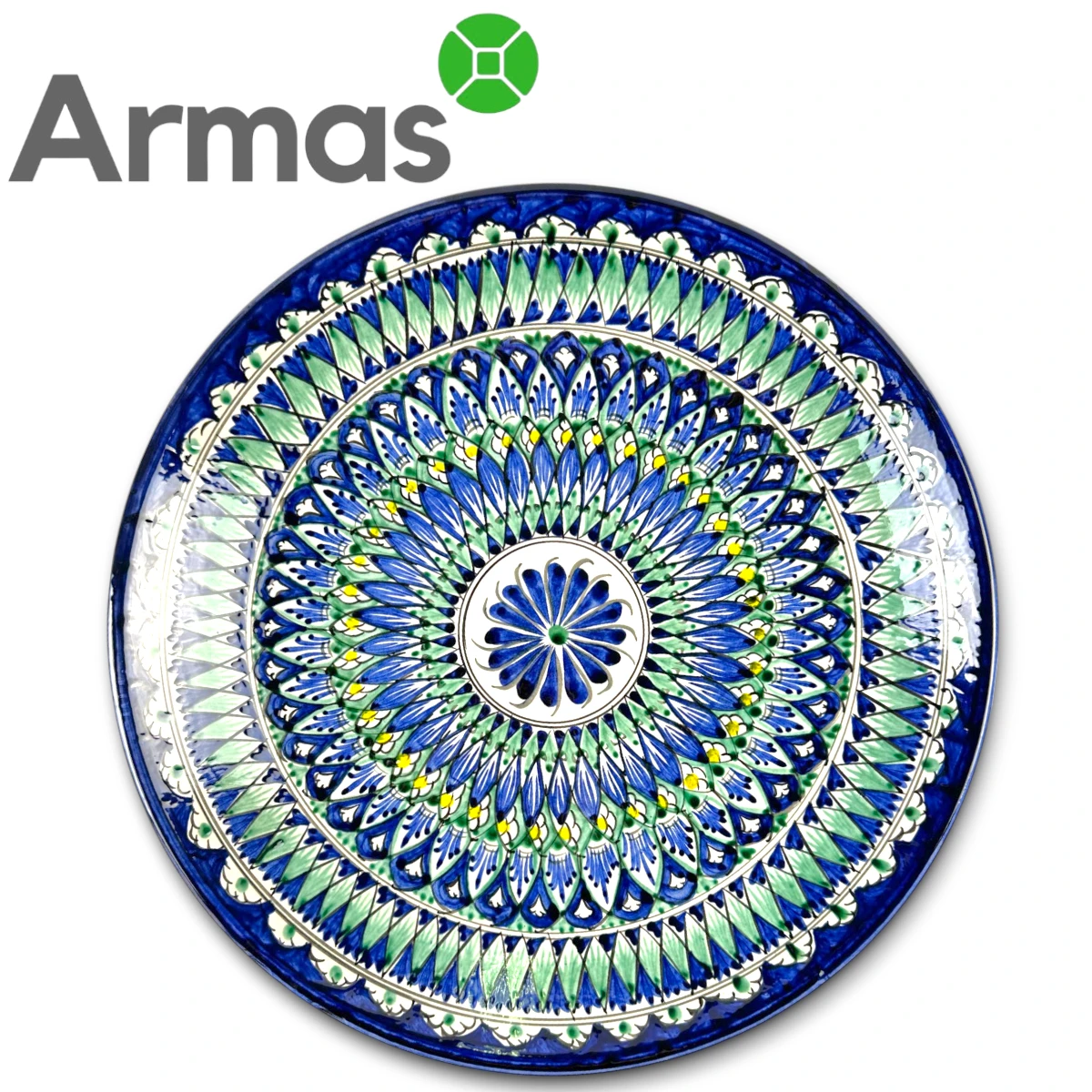 Керамическая тарелка ручной работы с симметричным зелено-голубым орнаментом. Диаметр 42 см — подходит для плова или в качестве элегантного восточного декора.