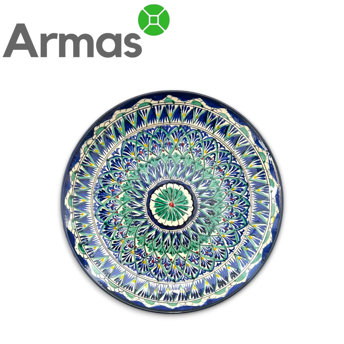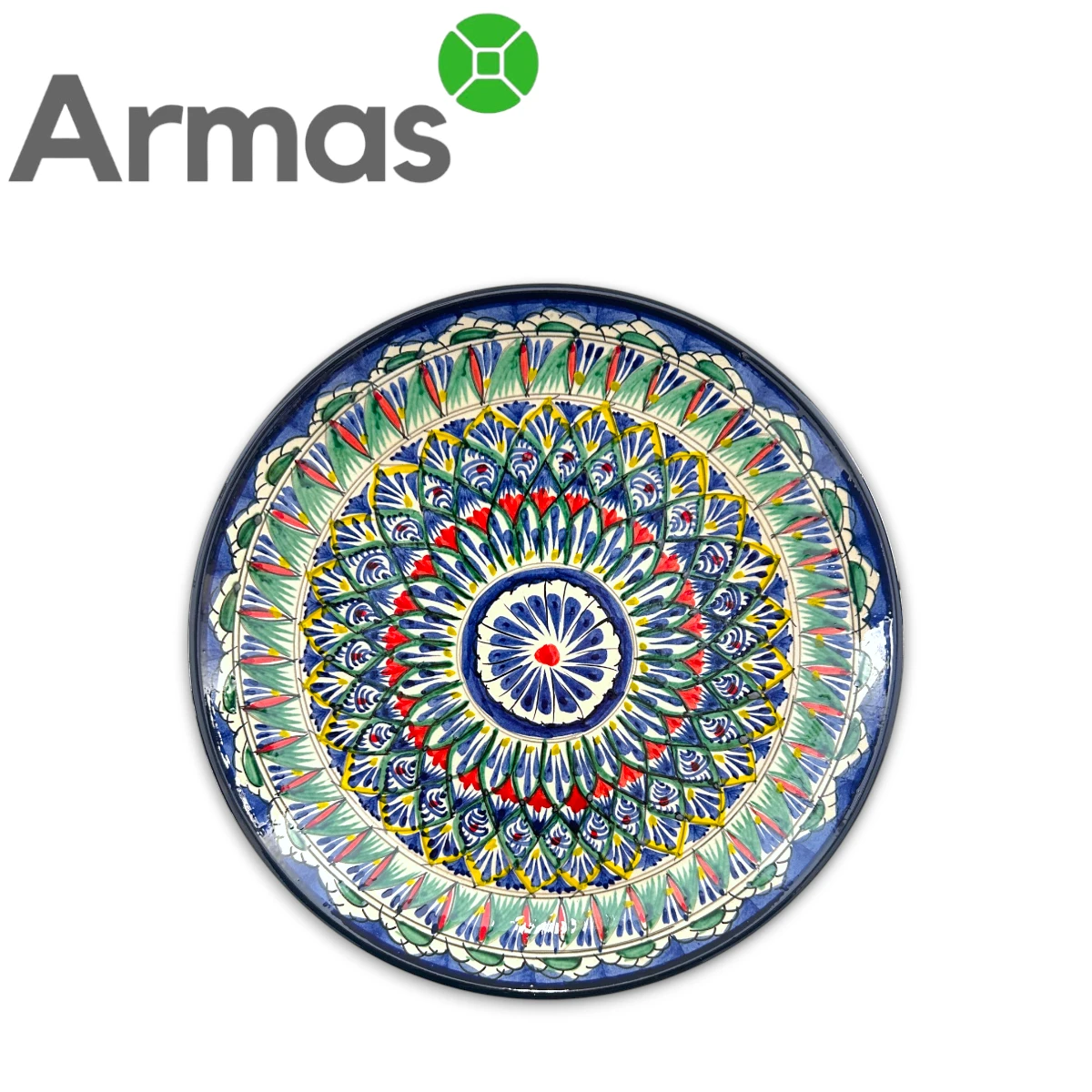Ручная работа — керамическая тарелка для плова из Узбекистана с традиционным восточным орнаментом. Идеально подходит для праздничной сервировки или повседневного использования. Высококачественная глазурь и яркие краски превращают тарелку в настоящее произведение искусства.